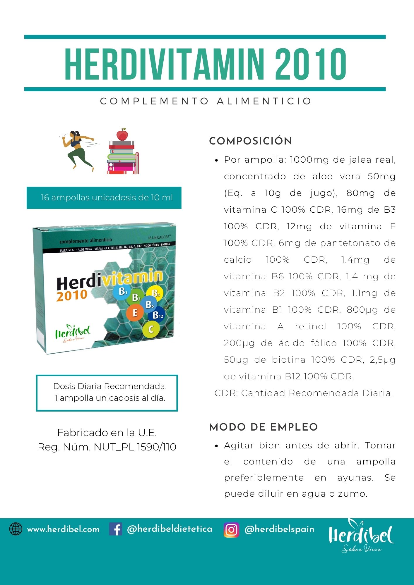 Composición: Jalea real, concentrado de aloe vera, vitamina C, vitamina B3, vitamina E, pantetonato de calcio, vitamina B6, vitamina B2, vitamina B1, vitamina A retinol, ácido fólico, biotina, vitamina B12.